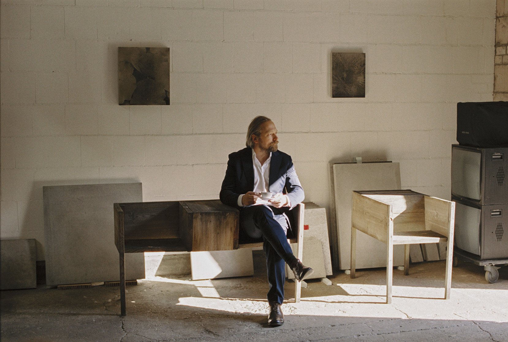 Some of his furniture pieces are in the studio. Bolted together from untreated wood, they seem a little uncomfortable, almost conceptual, but their unpretentious nature makes them also very inviting. Around us there are numerous chunky forms and panels of concrete, leaning on the walls in various sizes. Here Mielke develops photographs directly on concrete. Most of them are studies of the built environment and nature. In his art, images of plants, furniture or architecture become material objects of communication. He also works directly on objects and buildings in the urban context.