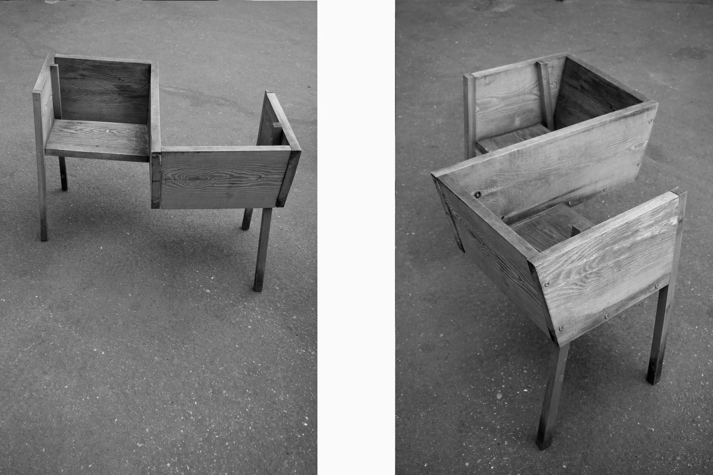 When I was asked what I could design, I had the simple thought: there are thousands of chairs, but only a few that you can sit as two people. I wanted to explore this theme, not so much in terms of precise craftsmanship, but more in a sketchy way, to see what happens to the conversation when two people sit together in different ways.