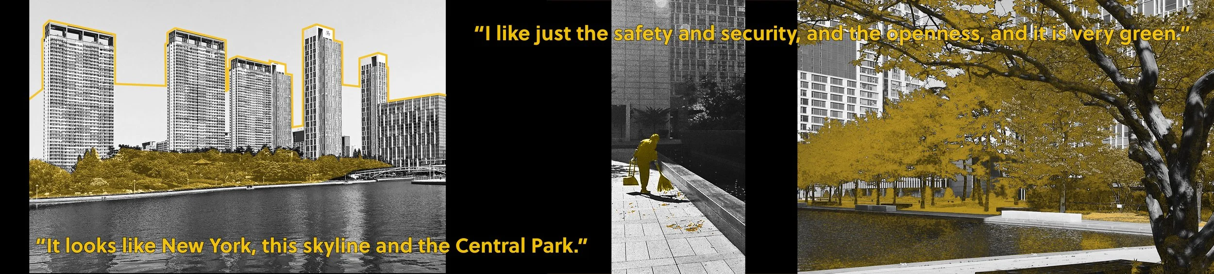 "I just like the safety and security, and the openness and it's very green, ...you feel like you're almost living in a semi-rural environment". These are open landscapes with free views and access. Only the imposing entrance gates with guards remind us of the physical enclosures of conventional gated communities: functionally superfluous, but emotionally very present, even without fences or walls.